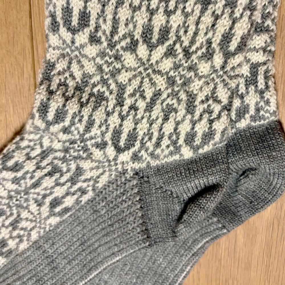 Durch das breite Bündchen sitzten die Wollsocken gut und die gekettelte Spitze sorgt dafür, dass Druckstellen vermieden werden.